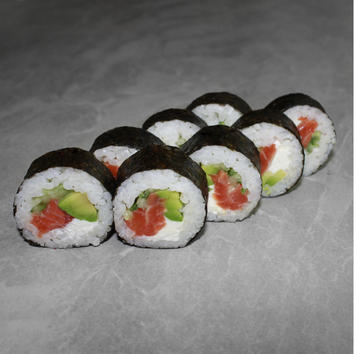 Состав: Рис, нори, лосось, сыр филадельфия, авокадо, огурец